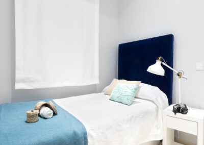 Superficie de 70m2. Tercer piso. La entrada conduce a amplia zona de salón-comedor que está amueblado con un sofá cama de tres plazas, dos sillones, una mesa de café de madera, estanterías con televisor LCD y DVD y una mesa de comedor de con sillas. Los dormitorios cuentan con armarios empotrados. El dormitorio principal tiene una cama doble (1,60×1,90) y el otro tiene una cama individual (0,90×1,90). Cuarto de baño con ducha. Dispone de un aseo adicional.