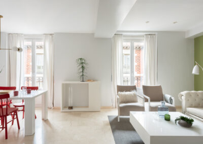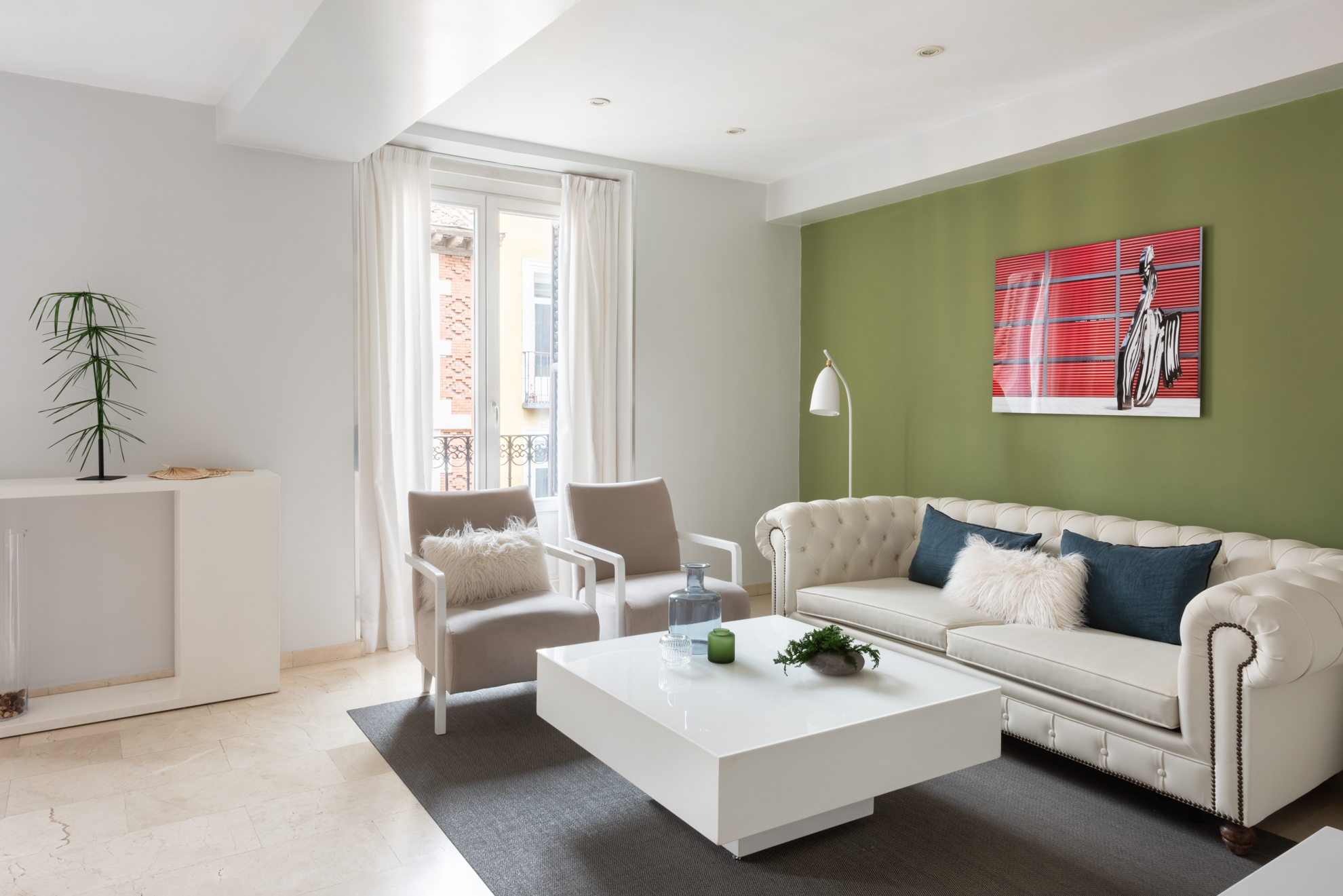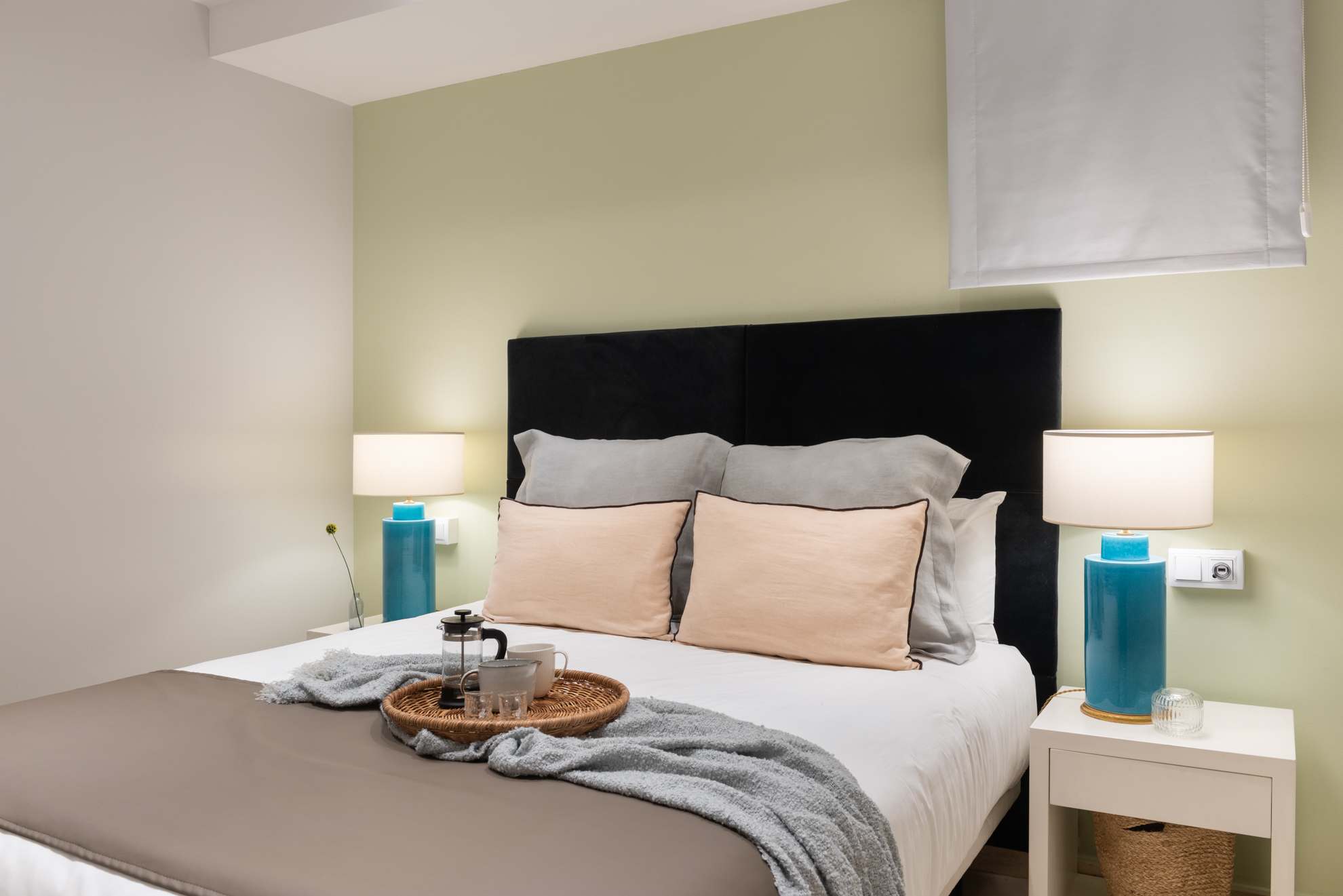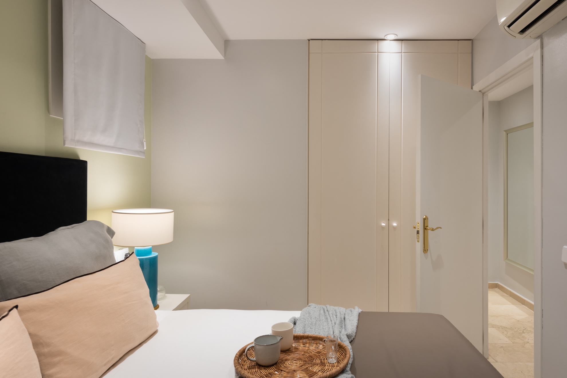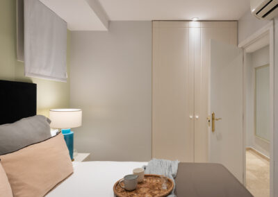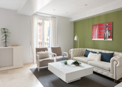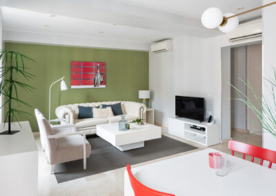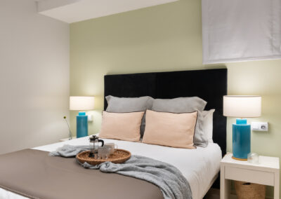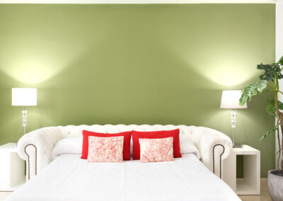 Apartamento de dos dormitorios cuyo salón cuenta con dos balcones que dan a la calle. Los suaves tonos que contrastan con la atrevida pintura verde dan al apartamento un toque de elegancia. Cuenta con dos dormitorios que están situados en el interior del edificio por lo que son muy tranquilos. El segundo dormitorio tiene una cama individual y un amplio armario. En el salón hay un sofá que se convierte en una cómoda cama para dos personas.