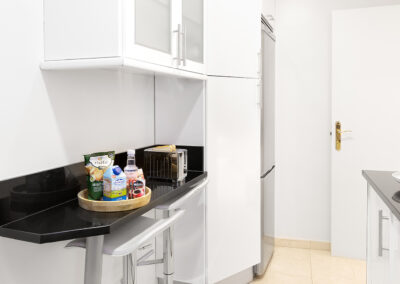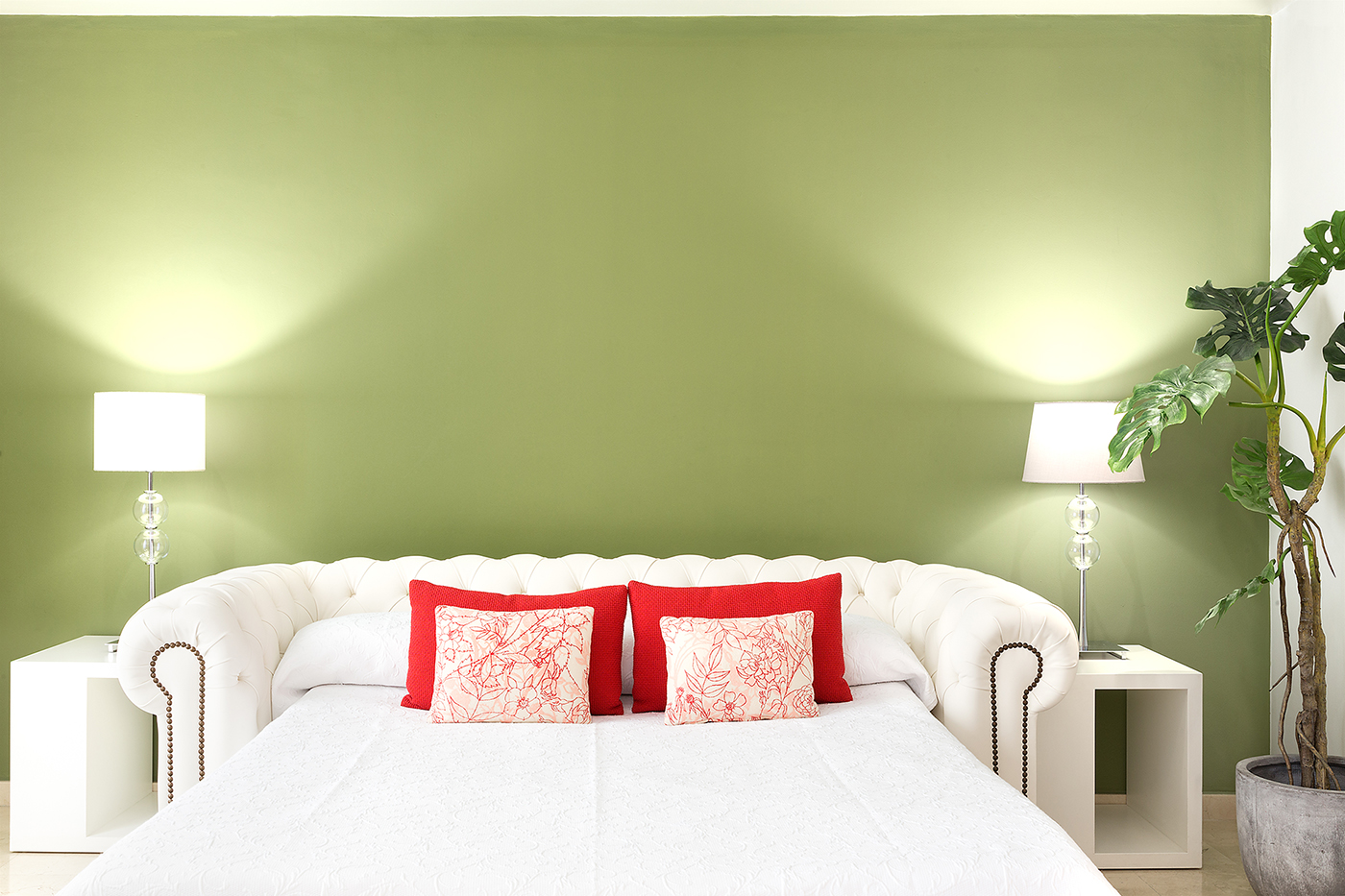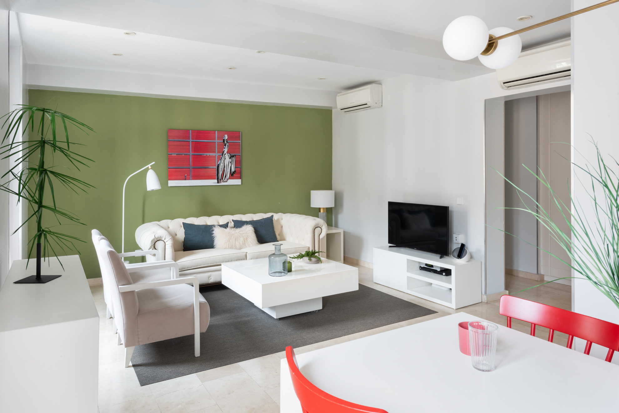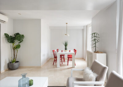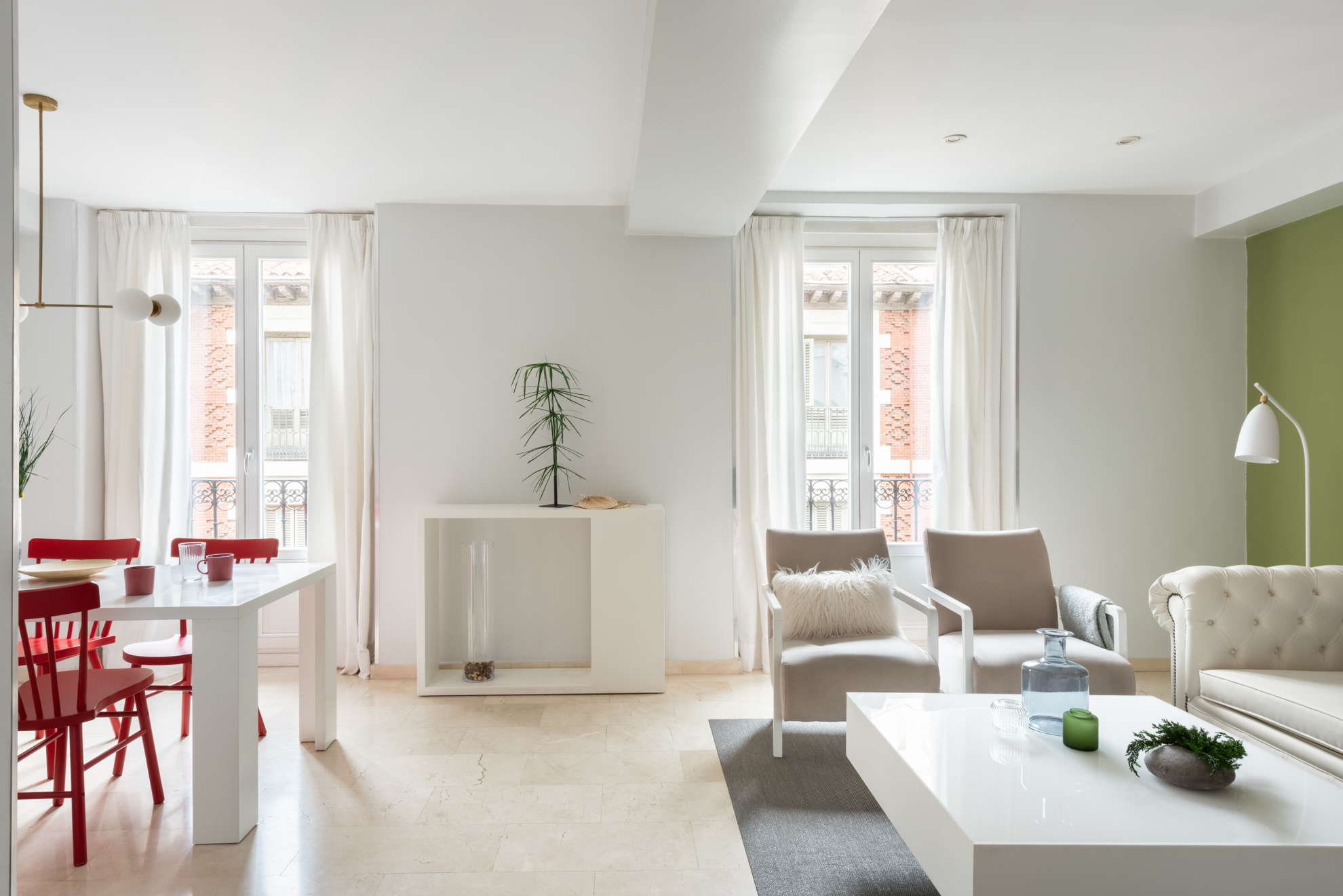 Apartamento de dos dormitorios cuyo salón cuenta con dos balcones que dan a la calle. Los suaves tonos que contrastan con la atrevida pintura verde dan al apartamento un toque de elegancia. Cuenta con dos dormitorios que están situados en el interior del edificio por lo que son muy tranquilos. El segundo dormitorio tiene una cama individual y un amplio armario. En el salón hay un sofá que se convierte en una cómoda cama para dos personas.
