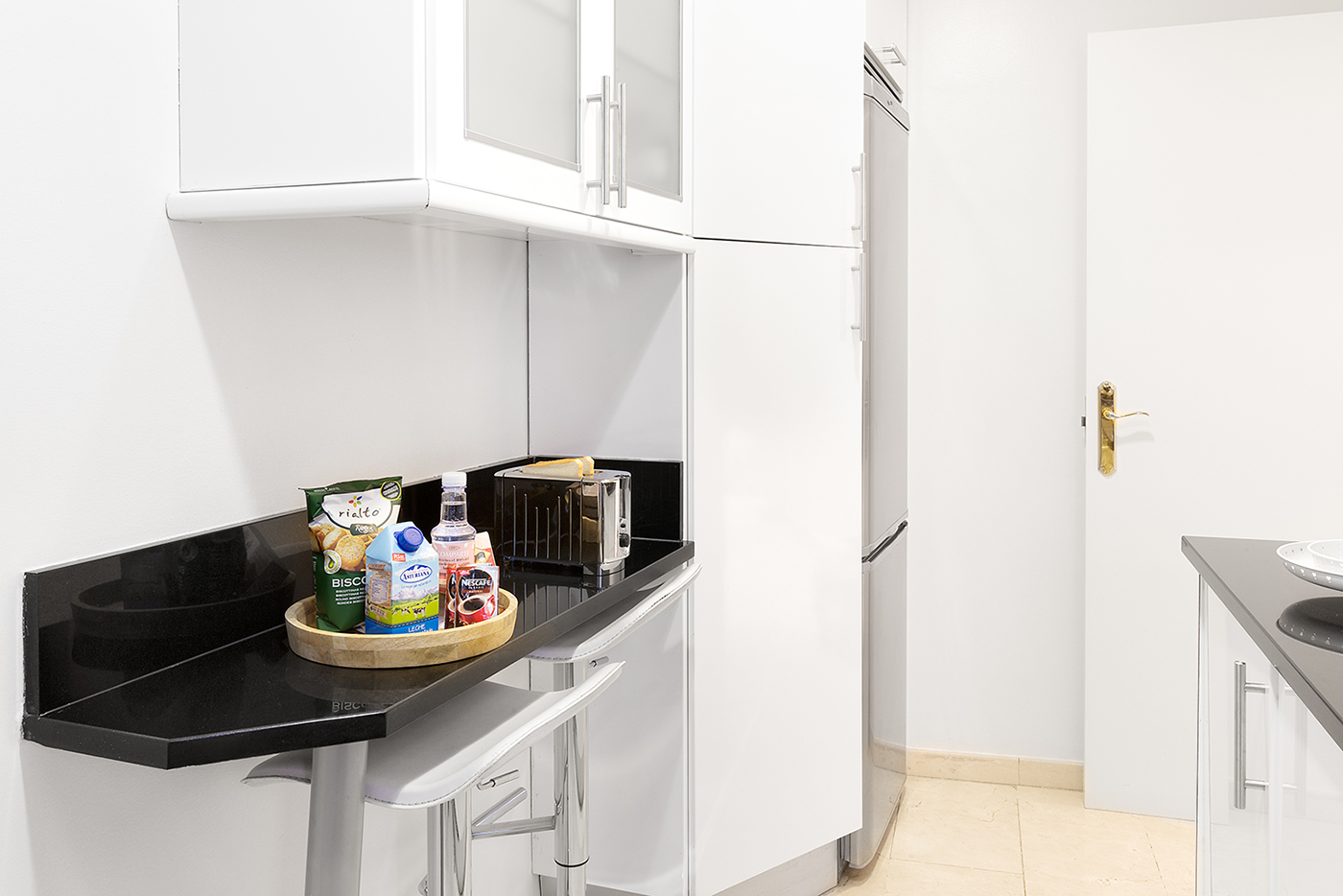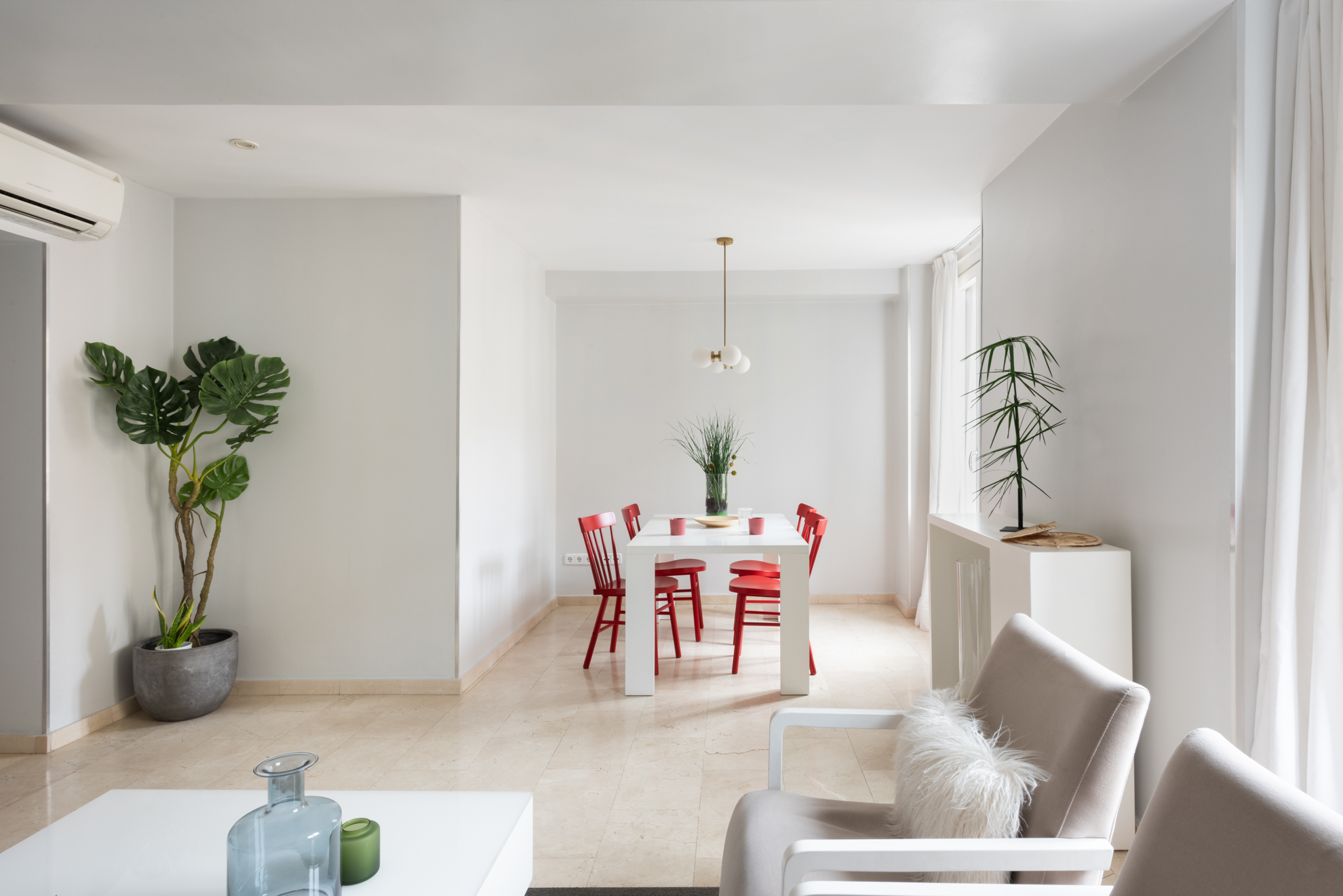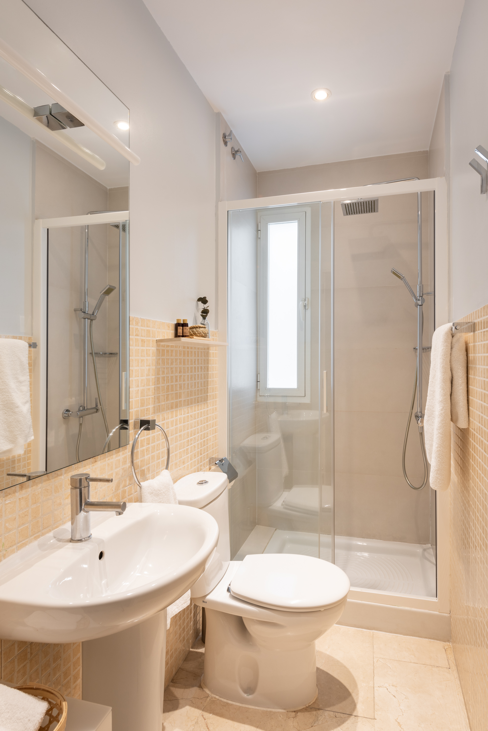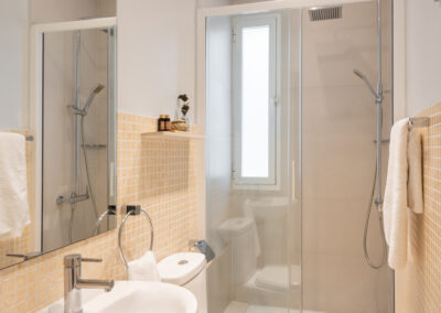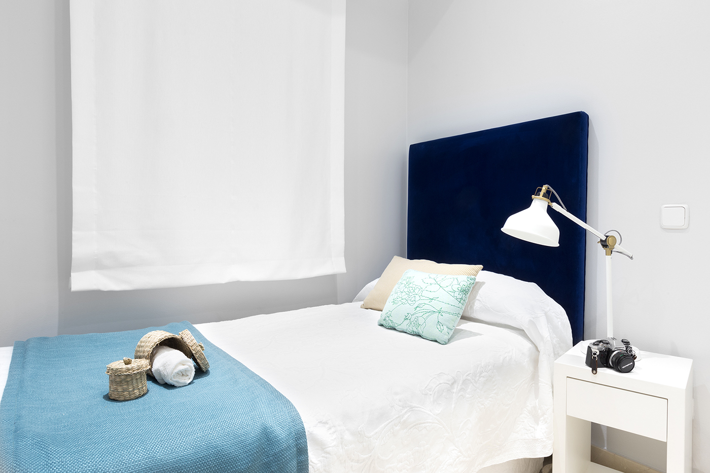 Apartamento de dos dormitorios cuyo salón cuenta con dos balcones que dan a la calle. Los suaves tonos que contrastan con la atrevida pintura verde dan al apartamento un toque de elegancia. Cuenta con dos dormitorios que están situados en el interior del edificio por lo que son muy tranquilos. El segundo dormitorio tiene una cama individual y un amplio armario. En el salón hay un sofá que se convierte en una cómoda cama para dos personas.